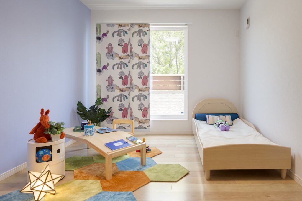お子さま部屋はやわらかな色味や模様を取り入れながらも、配置を抑えることで、遊び心がありつつ落ち着きのある和モダンの空間です。