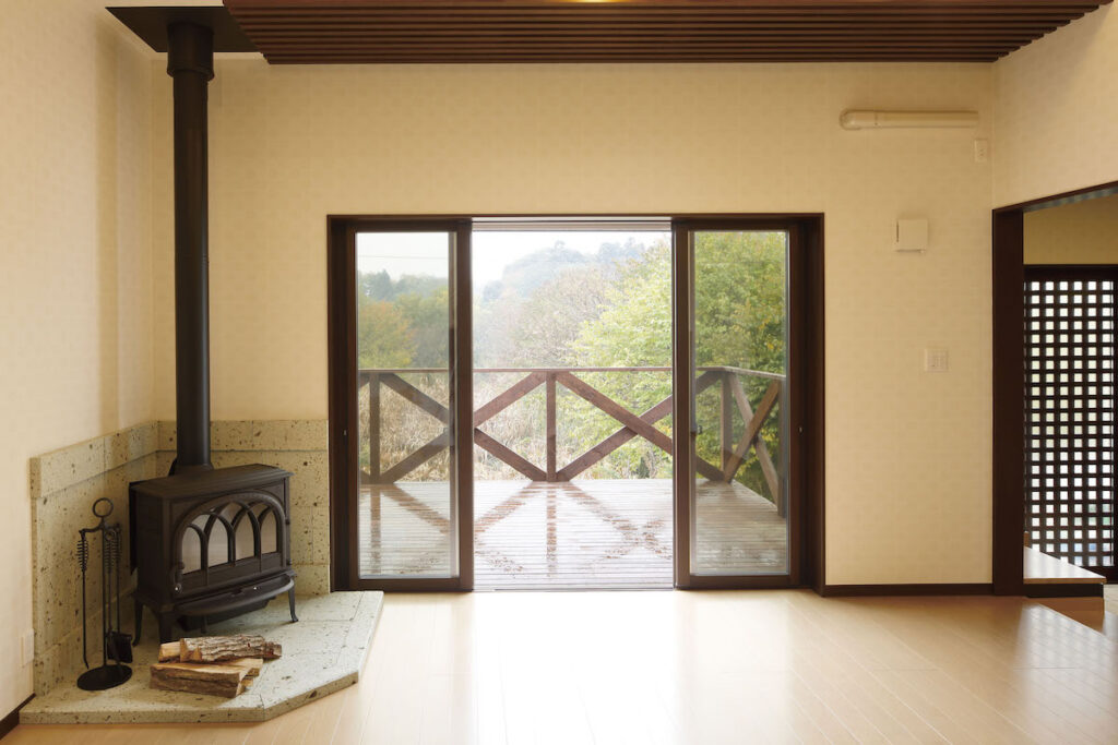 室内にはストーブを設け、格子状の仕切りや、外部空間の床や柵にも木を用いることで、空間に奥行きとあたたかみを持たせつつ、住まい全体の素材感をそろえています。