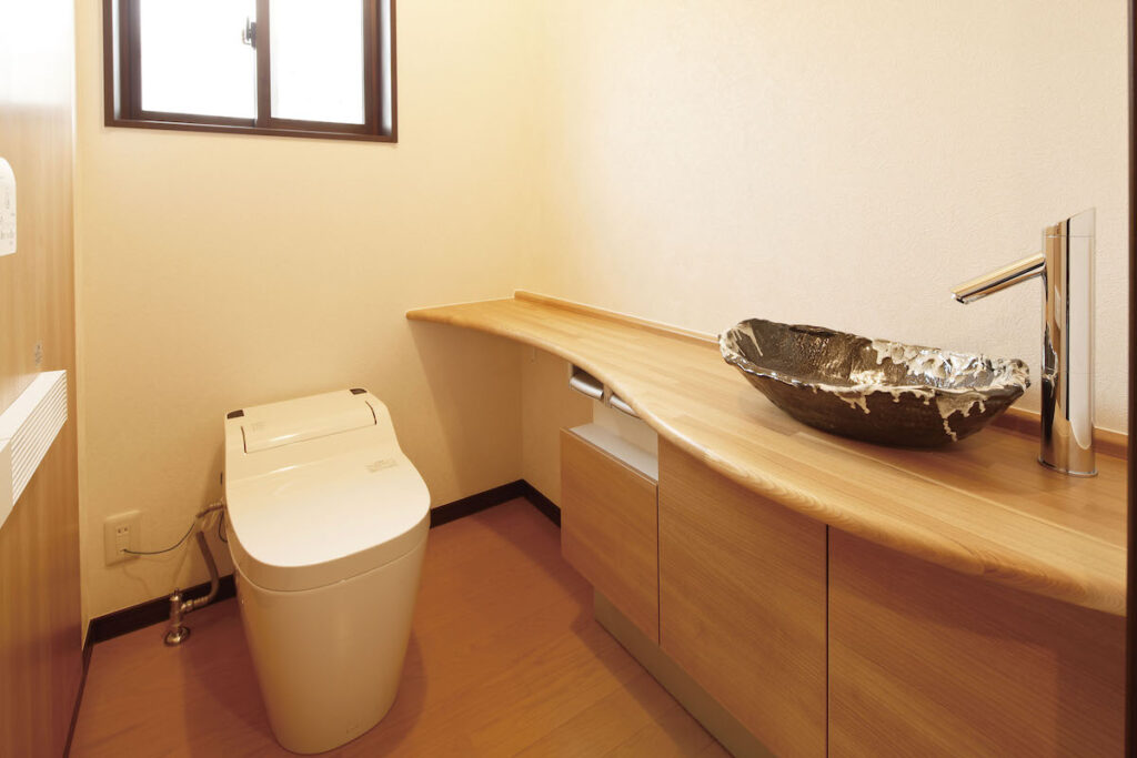 タンクレスですっきりとした印象にまとめたお手洗いは、曲線のあるカウンターや器を取り入れ、やわらかさを感じられるお住まいです。