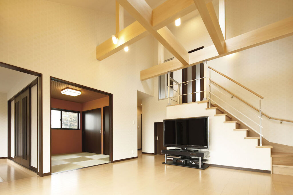 梁見せ天井は、吹き抜けや天井の高いリビングと相性がよく、視線が上に抜けることで空間の広がりを感じやすくなります。