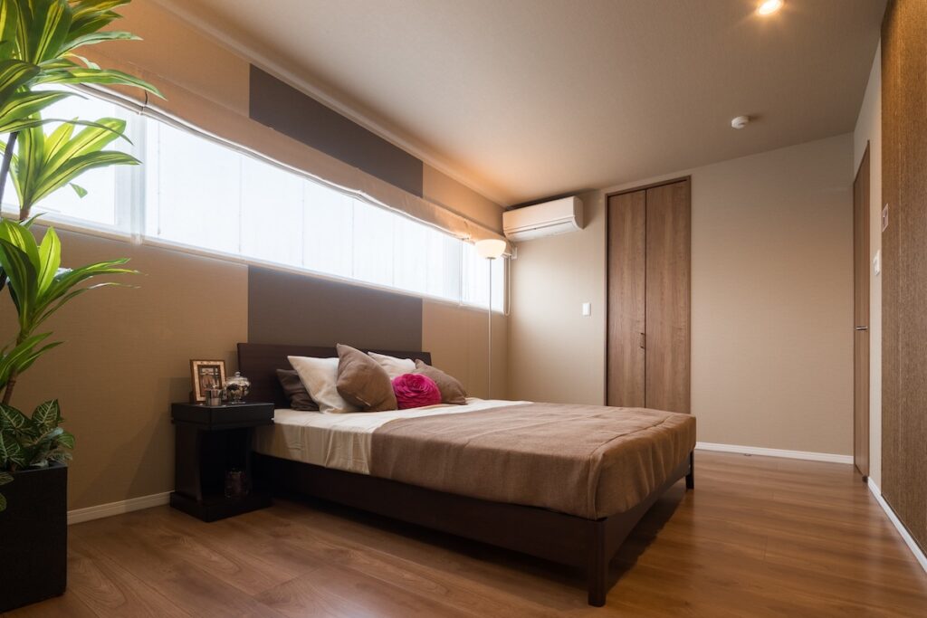 寝室の家具や小物はシンプルにまとめつつ、木の質感と照明が引き立つ落ち着いた雰囲気に仕上げています。