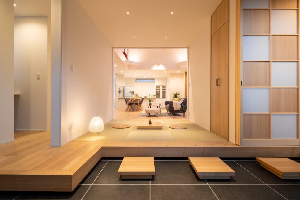 玄関土間を上った位置には畳の小上がりを設け、リビングへと視線が自然につながり、和モダンらしい奥行きを演出しています。